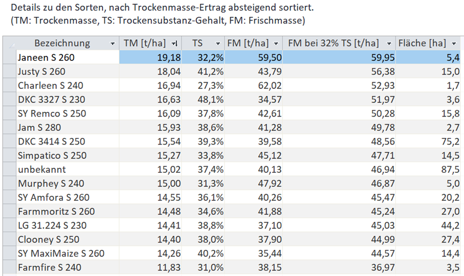 Maisernte 2024 Vergleich der Sorten nach Standorten